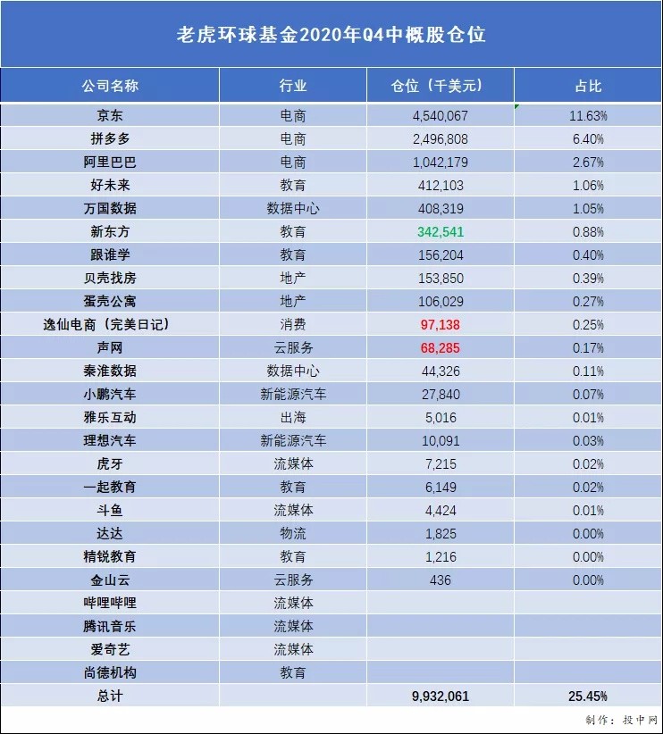 老虎對於中概股的選擇,基本是其 PE 部門投資策略的延續。如上圖所示,截至 2020 年四季度,老虎中概股倉位約佔其美股倉位的 25%,中國電商三巨頭京東、拼多多、阿里巴巴的頭寸超過 10 億美元,其中京東股票頭寸高達 45 億美元,是老虎環球基金持倉最高的股票,佔老虎全部美股頭寸的 11.6%。