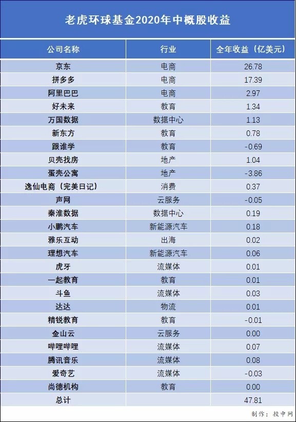 在老虎的中概股倉位組合中,京東、拼多多、阿里巴巴收益最高,三隻股票加起來的總收益高達 47.1 億美元,佔 2020 年全部中概股收益的 99%。