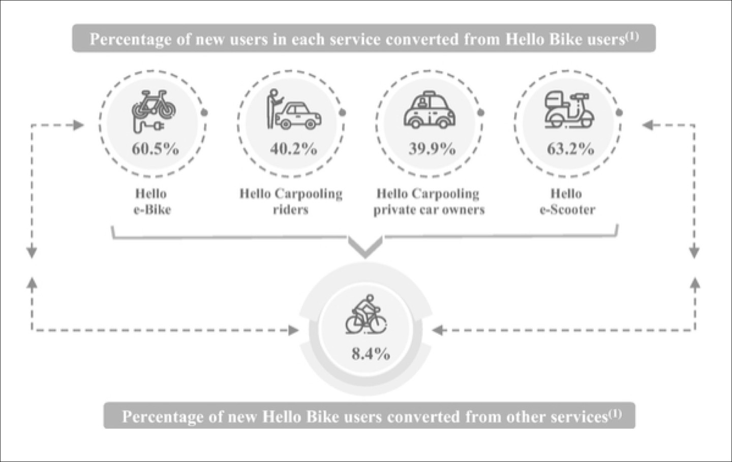 哈囉招股書顯示,有 34% 的用户使用過兩種或以上的哈囉服務。其中 60.5% 的哈囉助力車新用户、40.2%的哈囉順風車新交易用户、39.9%的哈囉順風車新接單司機、63.2%的哈囉電動車新用户來自哈囉單車服務。
