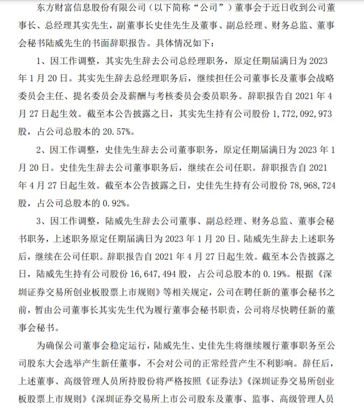 4 月 26 日晚間,東方財富發佈公告,宣佈三位高管職務發生變化。具體來看: