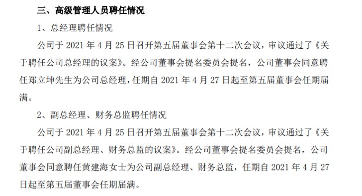 與之對應的,是東方財富公告中的另一部分內容——年輕的新高管聘任情況:聘任 1984 年出生的鄭立坤為新任總經理,黃建海為副總經理、財務總監。