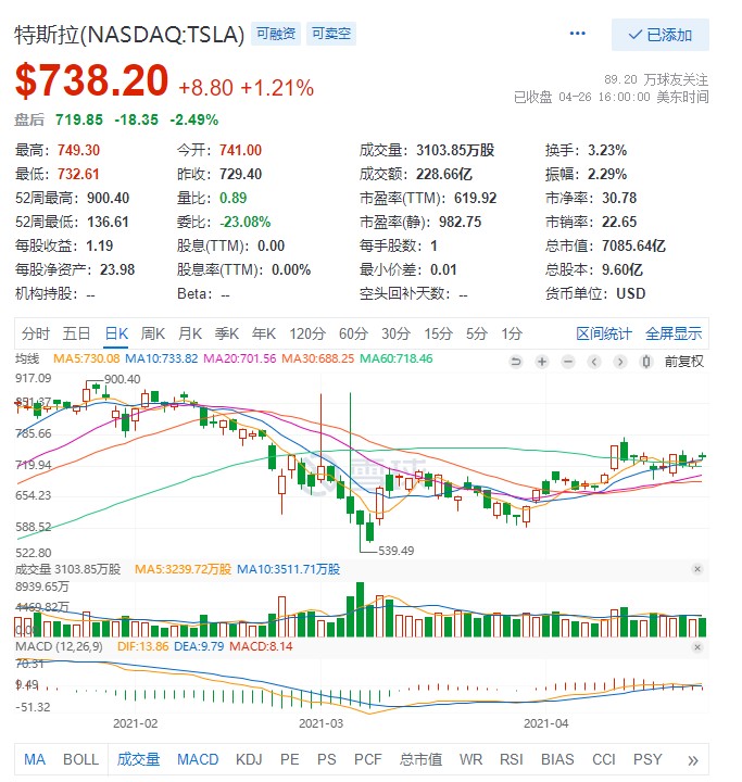 截止 4 月 26 號美股收盤,特斯拉股價漲 1.21%,報 738.20 美元。