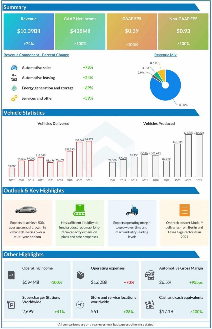 美股研究社(meigushe)消息,4 月 27 日,特斯拉公佈了 2021 年一季度財報。據財報數據顯示,特斯拉一季度總營收為 103.89 億美元,比去年同期的 59.85 億美元增長 74%;每股盈利 0.39 美元,市場預期 0