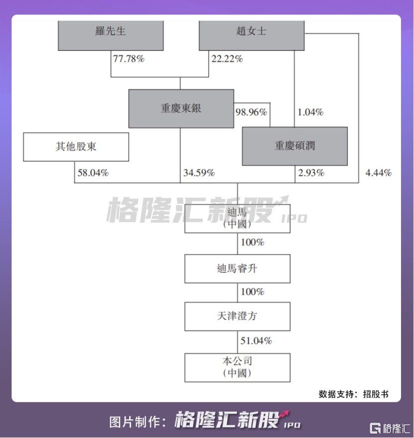 股東架構方面,在上市前的股權架構中,東原仁知服務集團的控股股東為迪馬股份,持股 51.4%,而迪馬股份的最大股東為羅韶宇、趙潔紅夫婦;栢天持股 25.41%,王浩通過全資擁有的瑞富資本集團 100% 擁有柏天;嘉實物業持股 13.57%;天津合夥持股 9.98%,天津合夥分別由範東、劉興主要持有。