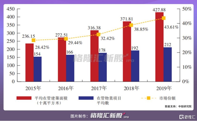 近年來,隨着城鎮化進程加快和人均可支配收入持續增加,物業百強企業管理的建築面積和物業項目數目快速增長。物業百強企業在管建築面積由 2015 年的約 23.62 百萬平方米增至 2019 年的約 42.79 百萬平方米,複合年增長率約為 16.02%。物業百強企業所管理物業項目的平均數目由 2015 年的 154 項增至 2019 年的 212 項,複合年增長率約為 8.32%。
