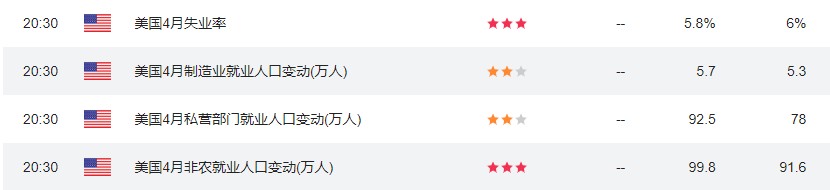 北京時間 5 月 7 日 20:30,美國勞工部將公佈美國 4 月季調後非農就業人口變動和失業率。
