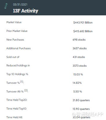 據統計,富國銀行一季度持倉總市值達 4439.21 億美元,上一季度總市值為 4156.82 億美元,環比增長 6.8%。富國銀行在一季度的持倉組合中新增了 698 只個股,增持了 2657 只個股。同時,富國銀行還減持了 3573 只個股並清倉了 431 只個股。其中前十大持倉標的佔總市值的 15.03%,較上季度的 15.35% 有所降低。