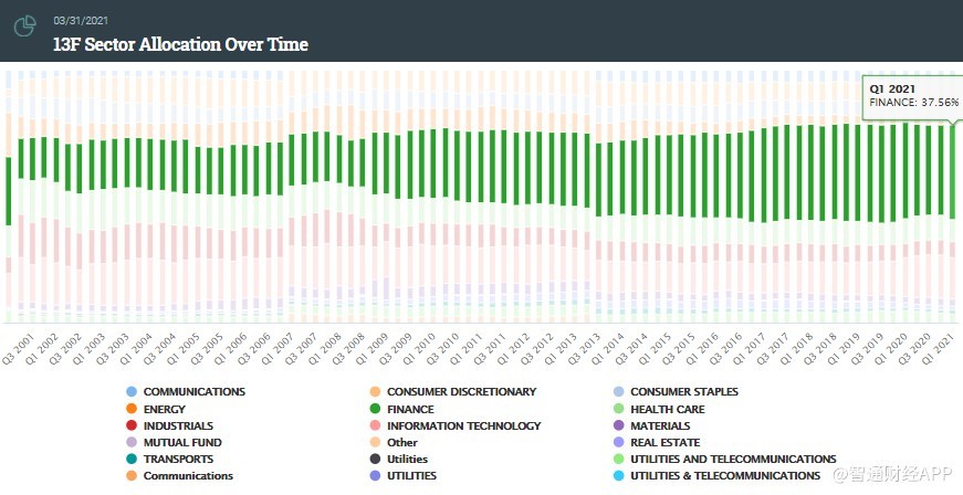 從持倉偏好來看,金融、IT 類及醫療保健個股位列前三,佔總持倉的比例分別為 37.56%,16.26% 以及 9.03%。