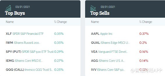 從持倉比例變化來看,前五大買入標的分別是:SPDR 金融行業 ETF(XLF)、iShares 羅素 2000 ETF(IWM.US)、標普 500 指數 ETF 看跌期權 (SPY.US,PUT)、iShares 新興市場 core ETF(IEMG.US) 和納指 100ETF 看漲期權 (QQQ.US,CALL)。