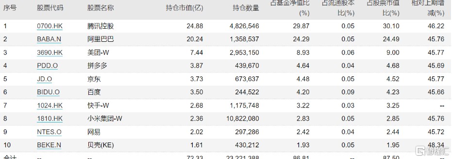 從持倉來看,港股主要的互聯科技均在裏面,重倉股當中,騰訊、阿里巴巴、小米的資金佔比在 8% 以上,京東健康、美團、快手科技資金佔比在 7% 以上;