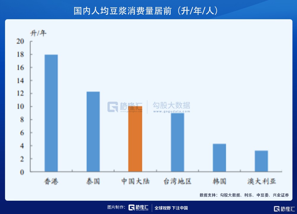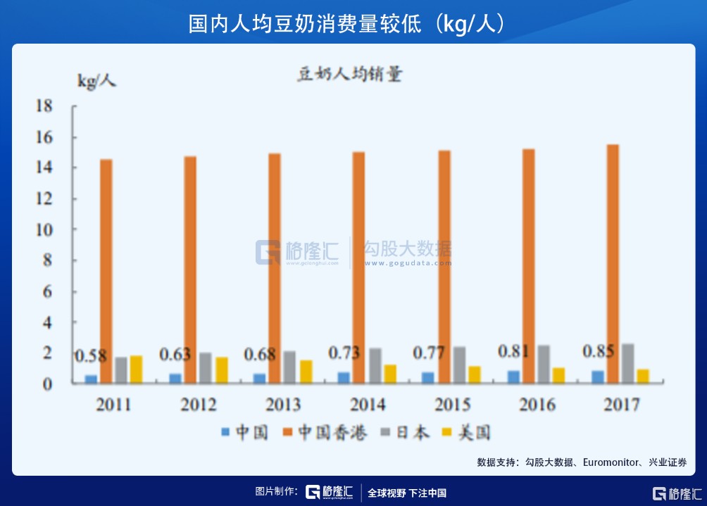 我們可以用另一個數據看下。根據 Euromonitor 統計,2017 年我國人均豆奶消費量僅為 0.85KG,香港人均消費量為 15.56KG,不跟香港比,與我們飲食習慣相近的日本,豆奶消費量也是我們的 6 倍,這裏可見我國的市場潛力。對標日本,國內潛在市場空間在 1000 億左右。