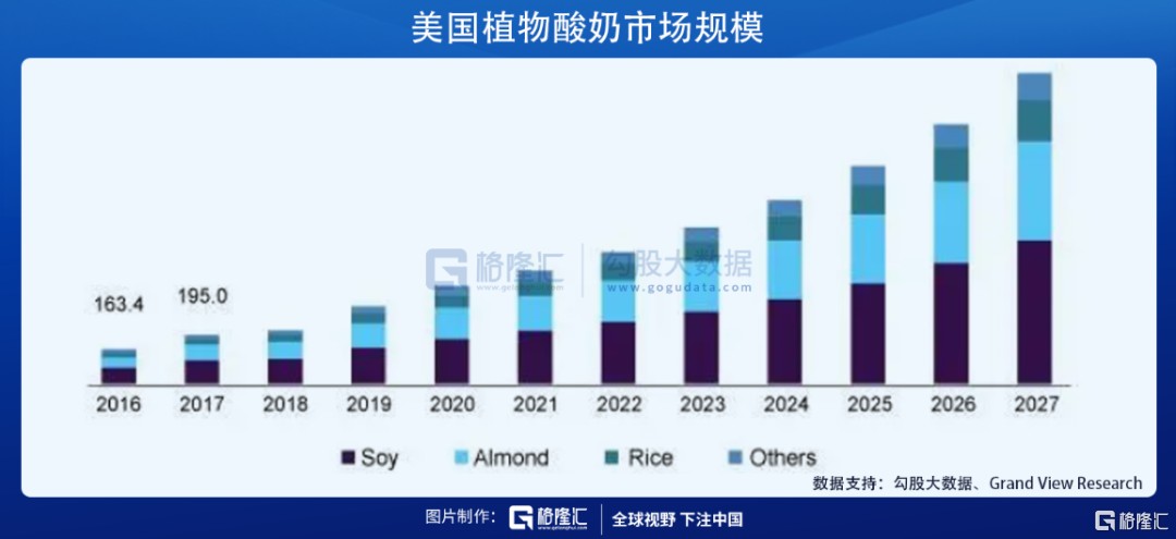 根據 Grand View Research,2016 年,美國植物基酸奶市場規模就已經達到 1.63 億美元,摺合人民幣 10.5 億元。可以説,歐美市場先於國內 5-10 年發展。