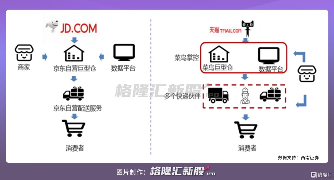 與此同時,京東物流有京東電商體系的商流作保障,這是三方物流公司不具備的天然優勢。而且在模式上,其也不同於菜鳥平台化的打法,即與物流商合作,不直接參與運輸,主要通過智能分單、路由規劃、菜鳥驛站、倉儲服務(自建 + 整合)等環節影響產業鏈運行。京東物流以自營倉儲(自建 + 整合)為主,並僱傭大量的快遞員,圍繞京東商城完善其物流配送體系,更加體系化。