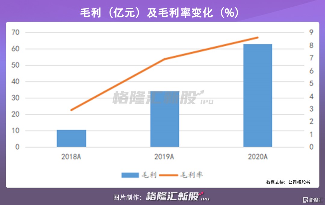 在營收快速上漲同時,毛利與毛利率水平也呈現穩步提升的趨勢,其中毛利從 11 億元猛漲至 63 億元,年均複合增速達 141%,對應的毛利率由 2.9% 提升了 5.6 個百分點至 8.6%。