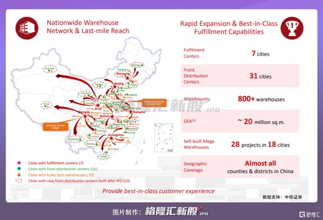 且倉庫佈局廣泛,並採取三級倉的佈局思路,在全國設置區域物流中心 (RDC,數量超過 300 個,覆蓋中國七大區)、前端物流中心 (FDC) 及其他倉庫。