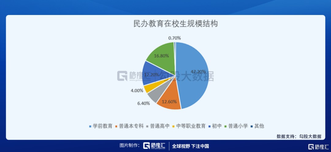 而另一方面,民辦教育中,高教板塊(普通本專科)在校生所佔比僅為 12.6%,僅為學前教育的約四分之一,即使比起民辦 K12,也仍有非常大的差距。在民促法實施條例落地後,政府的表態與對民辦高教成果的認可極可能對這個板塊產生二次催化。