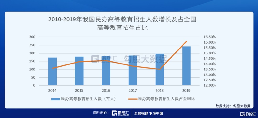 行業發展迅速,且增長空間廣闊,政策轉向或成為催化劑;在 2018 年之前,我國民辦高教招生人數一直處於基本穩定不變的狀態,從在 2018 年的《中華人民共和國民辦教育促進法實施條例(修訂草案)(送審稿)》遞交後,無論是政策端還是市場對民辦高教的青睞程度有了明顯提升,2018 年突破了 200 萬人,2019 年接近招生 250 人,全國招生人數佔比也提高了一個百分點,政策催化帶來的增長十分迅速。