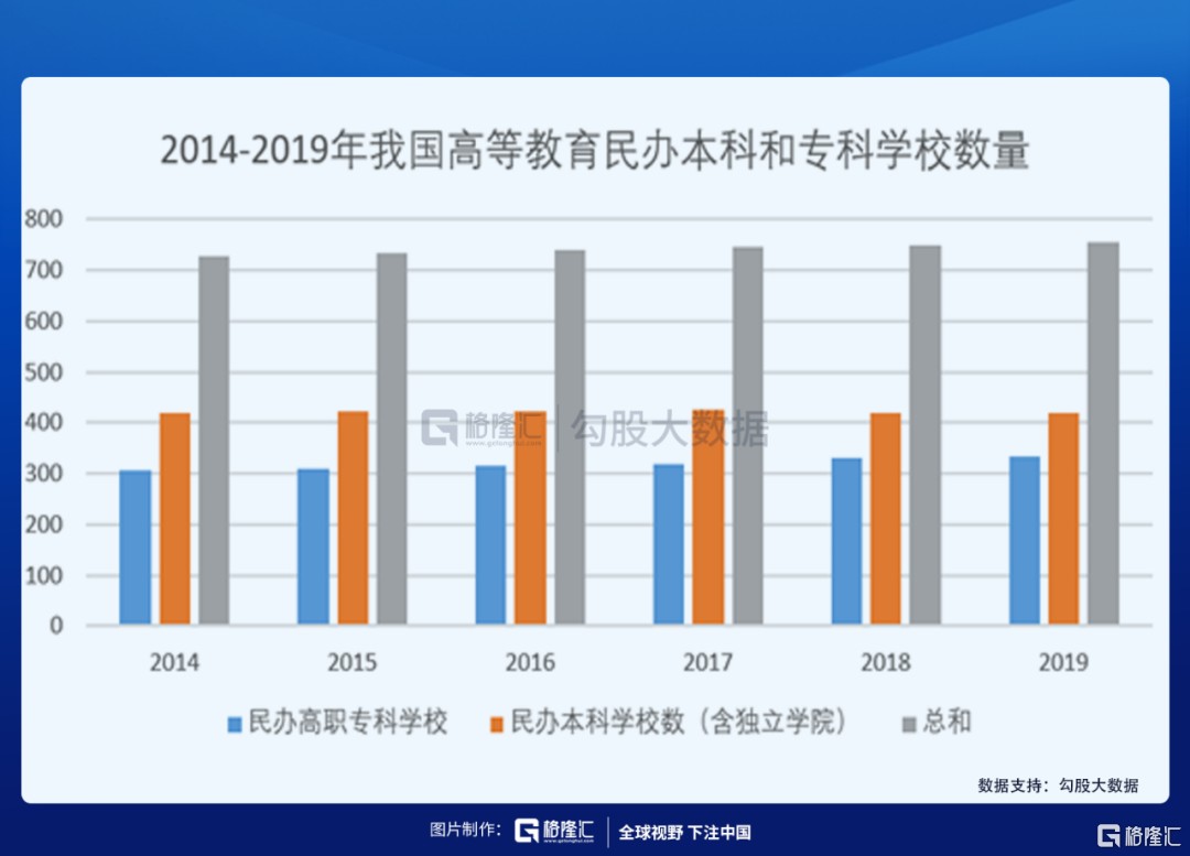 牌照優勢限定了供給門檻,所以民辦高教學校,無論是本科或者是專科、職校,多年來整體數量保持在一個比較穩定的水平,總量維持在 700-800 所之間,政府對新頒發高教牌照採取非常嚴格謹慎的態度,並不間斷撤銷既有的民辦高校編制,理由包括招生數、教學質量不達標等,其次是校園用地審批難的問題,校園用地從審批到投入運營,約 5-8 年,爬坡期非常漫長,因此集團化辦學多采取併購的方法。但這兩個部分都是可以通過政策寬鬆予以解決的;而民促法實施條例的落地,文中明確表明了官方對民辦高教的支持態度,在未來這些因素市場都給予樂觀預期。