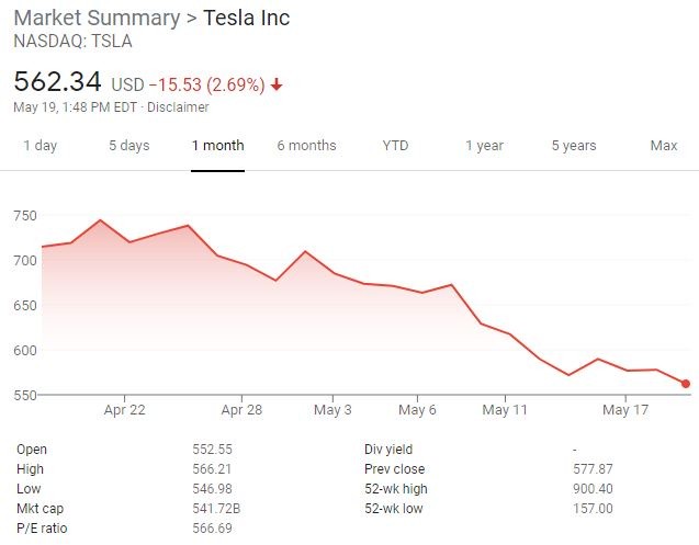 電動汽車巨頭特斯拉自 4 月 26 日發佈一季報以來便進入下行通道,截至本週二收盤股價累跌近 22%,更是較 1 月所創逾 900 美元的歷史新高回落近 36%,週三該股再跌 3%。