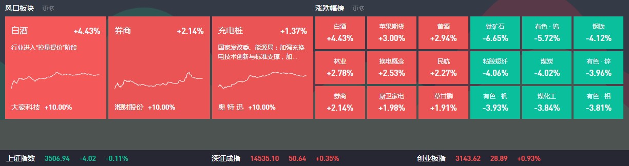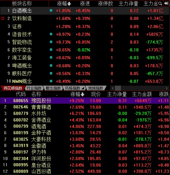 盤面上,白酒、證券、中藥等板塊漲幅居前。