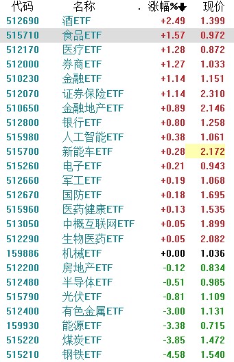 A 股分化,行業 ETF 也分化明顯。截至收盤,酒 ETF 漲超 2%,食品 ETF 漲超 1.5%,醫療、券商、金融保險 ETF 漲超 1%。與此同時,資源股 ETF 重挫,鋼鐵 ETF 跌 4.58%,煤炭 ETF 跌近 4%,有色金屬 ETF 跌 3%,能源 ETF 跌超 3%。