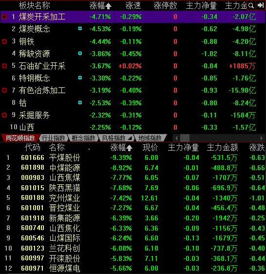煤炭、鋼鐵、有色等紛紛重挫。金嶺礦業跌停,首鋼股份、海南礦業、八一鋼鐵、山西焦化、江西銅業、錫業股份等個股均跌超 6%。