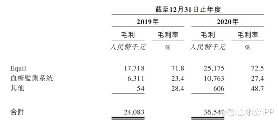 雖然血糖監測系統營收佔比略勝 Equil 一籌,但從毛利率角度來看,Equil 毛利率遠遠高於血糖監測系統。招股書顯示,微泰醫療 2019 年和 2020 年毛利率為 46.4% 和 48.5%,其中 Equil 毛利率分別為 71.8% 和 72.5%,而營收佔比較高的血糖監測系統毛利率僅為 23.4% 和 27.4%,由此來看,Equli 才是微泰醫療的核心利潤來源。