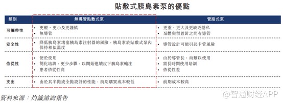 面對如此大的市場,國內不少醫療器械企業躍躍欲試,微泰醫療就是專注於糖尿病醫療器械研發的企業之一。其核心產品胰島素泵,就是一種有效的糖尿病管理醫療器械,用於需要胰島素治療的 1 型糖尿病和 2 型糖尿病患者的胰島素輸注。胰島素泵可分為無導管貼敷式泵和管路式胰島素泵。相比於管路式泵,無導管貼敷式泵具有前期購買成本低、依從性高等優勢。