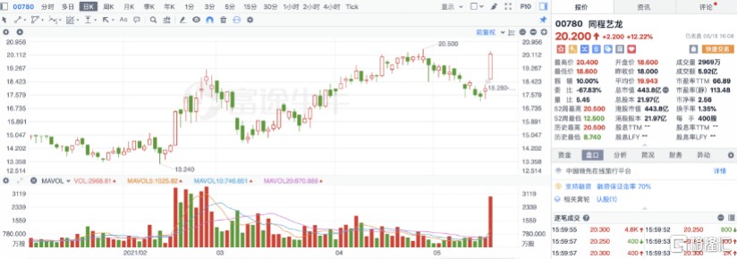 整體上來看,2021 年第一季度,公司公佈的業績增長情況再一次超越市場預期,這是公司自疫情發生後連續第五個季度實現盈利,也是全球範圍內 OTA 行業裏唯一的一家能夠在疫情期間保持連續盈利的上市公司:同程藝龍不但在營收和盈利恢復速度方面繼續引領 OTA 行業,而且一季度公司的多個關鍵指標創下了歷史新高。與此同時,公司的股價在業績公佈後的首個交易日以 20.2 港元的收盤價,單日漲幅達 12.2%。