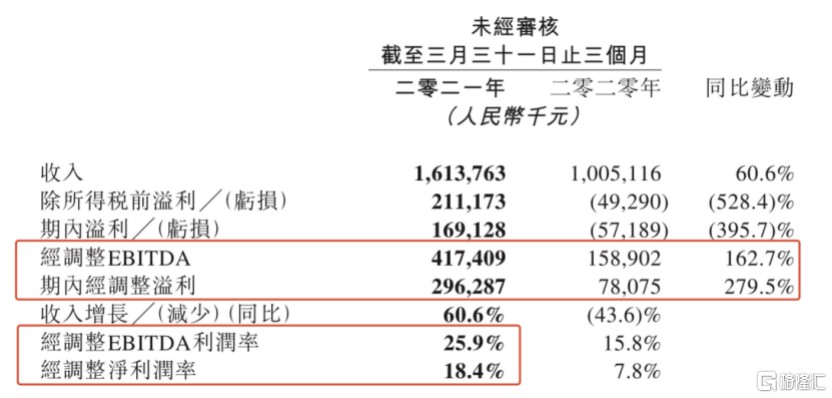 一季度,經調整 EBITDA(税息折舊及攤銷前利潤)為 4.17 億元,同比增長 162.7%。經調整 EBITDA 利潤率由 2020 年同期的 15.8% 上升至 25.9%,同時毛利率更是達到了 74.7%,均超疫情前同期表現(2019 年一季度)。一季度經調整淨利潤率由 2020 年同期的 7.8% 提高至 18.4%。另外,一季度公司歸母淨利潤錄得 1.7 億元,較 2019 年同期增長約 75%。