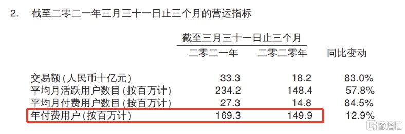 年付費用户數據錄得的數字為 1.69 億,同比增長 12.9%,據 2020 年年報公佈數據,截止 2020 年 12 月 31 日,公司的年付費用户為 1.55 億,也就是説,僅第一個季度便較去年年底增長了 8.3%,筆者據此保守估計,全年預期實現 35%-40% 區間或以上的增長。