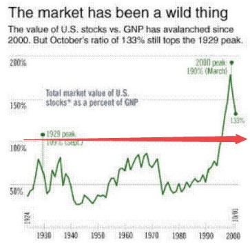在 2001 年的时候,你可以看到这个指标最近的位置在 133%,即使这样,还是从 2000 年高点大跌了许多的结果。”