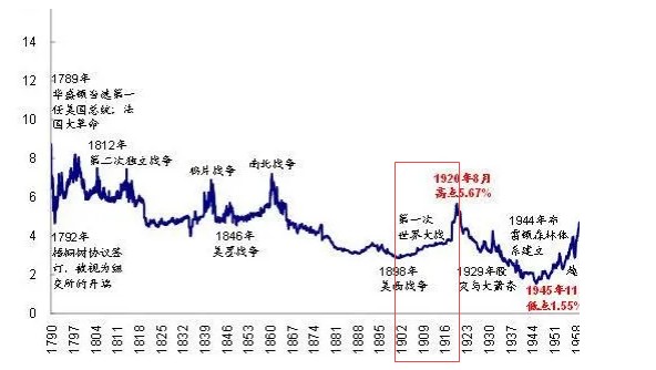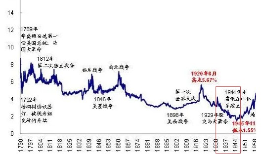从下图可以看出,1929 年股灾之后,美国的利率就一直走在下降通道里,直到 1945 年的最低点 1.55%。