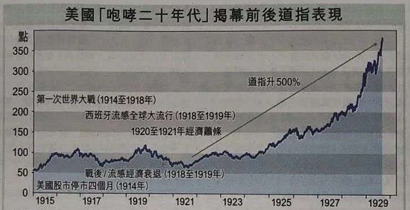 在利率走低和货币宽松的背景下,美国迎来了咆哮的二十年代。道琼斯指数在接下来的九年时间,上涨了 500%。