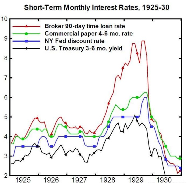 为拯救经济,整个二十年代美联储开始了持续的降息,利率水平在不断走低。
