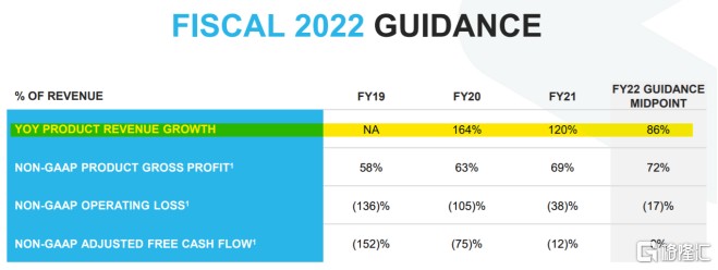 在昨天發佈的季報中,公司給出的下季度營收指引為 2.35 億-2.40 億美元,也就是説,同比增速的上限為 92%,與本季度報告中的 110% 相比明顯的放緩。而今年全年(2022 財年)產品收入增長率指引的中位數僅為 86%,較去年的 120% 也打了不小的折扣。
