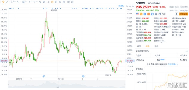 在 IPO 過程中,Snowflake 發行股票 2800 萬股,融資 33.6 億美元,也成為了美國股市有史以來規模最大的軟件類公司 IPO。Snowflake 上市當天,開盤首秀便從 120 美元的發行價直線拉昇到了接近 300 美元的位置,最終收漲 111.61%,報 253.93 美元,市值超過了 700 億美元。