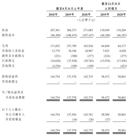 截至 2018 年、2019 年及 2020 年 8 月 31 日止年度以及截至 2019 年及 2020 年 12 月 31 日止四個月,公司分別產生總收益人民幣 2.674 億元、人民幣 2.663 億元、人民幣 2.711 億元、人民幣 1.109 億元及人民幣 1.103 億元。