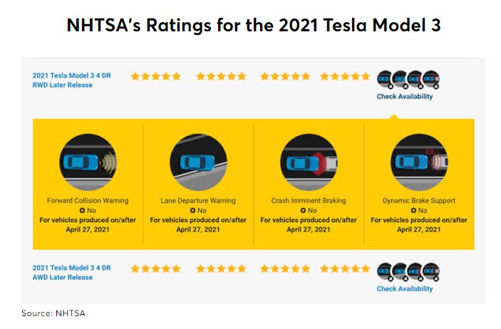 NHTSA 認為,缺少這些安全功能的原因是特斯拉不再為其 Model 3 和 Model Y 配備雷達傳感器,並表示將在 2021 年 4 月 27 日或之後生產的 Model 3 和 Model Y 車輛將不再獲得該機構對 FCW、AEB、LDW(車道偏離警示)和動態制動支持的複選標記。