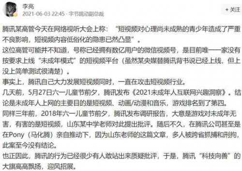 對此,針對騰訊副總裁批 “低智短視頻像豬食,拉低用户心智” 一言論。字節跳動副總裁李亮公開發文回懟表示,“這位高管可能並不知道,號稱已經擁有數億用户的微信視頻號,是目前唯一一家沒有按要求上線 ‘未成年模式’ 的短視頻平台。”事實上,騰訊自己大力發展短視頻同時,一直在攻擊短視頻行業。