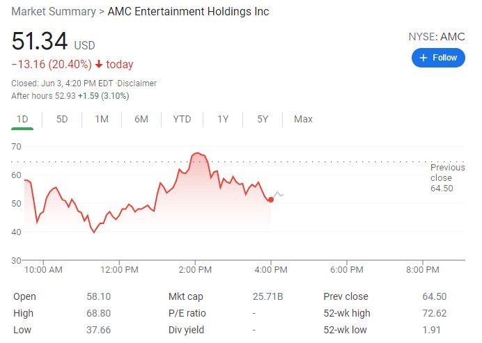 直到收盤前兩小時,AMC 才止跌轉漲,日內最高漲近 7%,重新逼近 69 美元。公司 CEO 宣佈已完成這批的全部股票出售,均價約為 50.85 美元/股,募集到大約 5.874 億美元新股本權益。AMC 週四最終收跌 20.4%,報 51.34 美元。