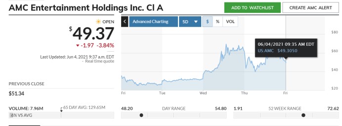 AMC 院線在本週創下歷史新高,最高價達到 72.62 美元,然後一路回落至當前的 49.37 美元。
