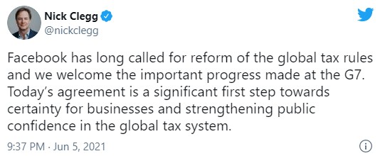 Facebook 全球事務副總裁 Nick Clegg 在推特上表示,該公司長期以來一直呼籲改革全球税收規則,他們歡迎七國集團取得的重要進展。