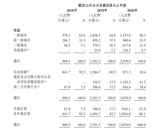 奈雪的茶會員體系有註冊會員約 3470 萬名。2020 年,奈雪的茶訂單總數中約 49.0% 來自會員。通過微信及支付寶小程序以及奈雪的茶應用程序,客户能夠輕鬆加入會員體系,找到最近的奈雪的茶茶飲店,並輕鬆下達外賣及自提訂單。於 2018 年、2019 年及 2020 年,奈雪的茶訂單中分別約有 4.4%、12.5% 及 22.9% 為客户通過微信及支付寶小程序、奈雪的茶應用程序以及其他第三方外賣平台下達的外賣訂單。