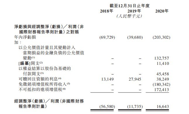 經調整淨虧損 (非國際財務報告準則計量) 由 2018 年的 5658 萬元大幅減少至 2019 年的 1173.5 萬元,並進一步扭轉為 2020 年的經調整淨利潤 (非國際財務報告準則計量) 1664.3 萬元。