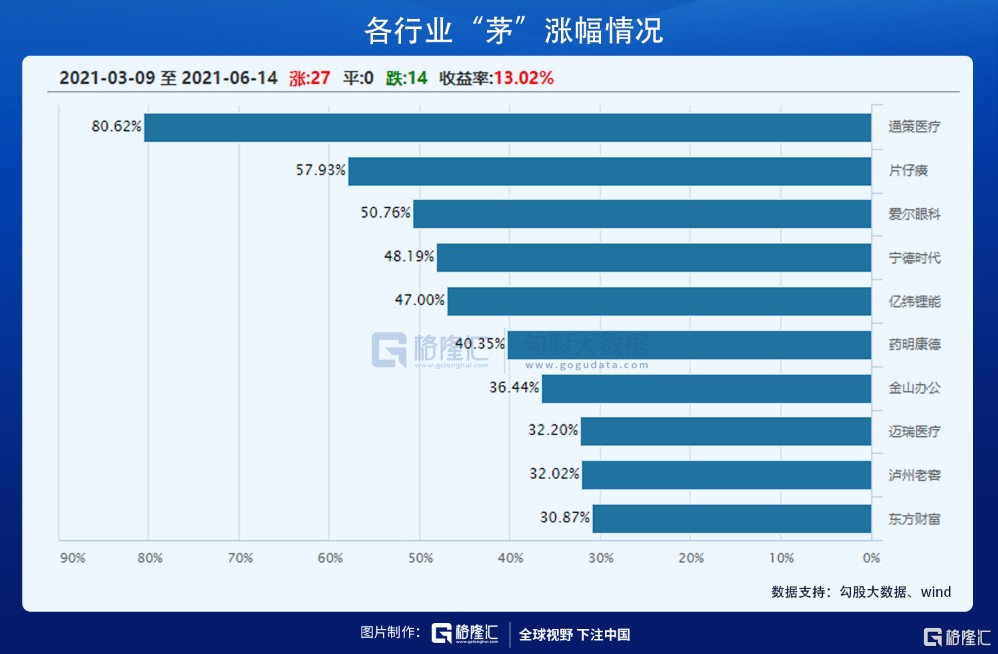 即使是各自的茅整體也漲多跌少,通策醫療反彈了 80%,離年初歷史最高點僅差 1 分錢。片仔癀、愛爾眼科、億緯鋰能、藥明康德這些也反彈超過 40%。寧德時代也不僅反彈 50% 創歷史新高,還成為了 A 股有史以來第一家原生的萬億市值科技公司。