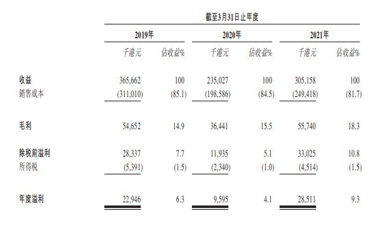 招股書顯示,2019-2021 年,熒德控股的收入分別為 3.65 億港元,2.35 億港元,3.05 億港元。年度盈利分別為 2294.6 萬港元,959.5 萬港元,2851.1 萬港元。
