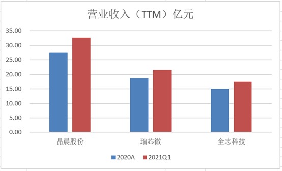 晶晨股份是三家中營業收入最高的企業,在 2021 年一季度,營業收入 TTM(滾動收入)為 32.64 億元,環比增長 19%,也是三家企業中增速最高的。瑞芯微和全志科技在 21 年一季度營業收入分別為 21.58 億元和 17.45 億元,均增長 16%。綜上來看,在營業規模上晶晨股份排名最高。