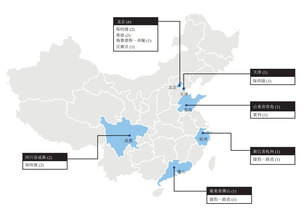 截至 2021 年 6 月 21 日,該公司在中國六個省市經營 12 家保時捷、奧迪、梅賽德斯 - 奔馳、賓利、沃爾沃及美洲虎 - 路虎品牌的 4S 經銷店,包括北京、天津、山東、四川、浙江及廣東。