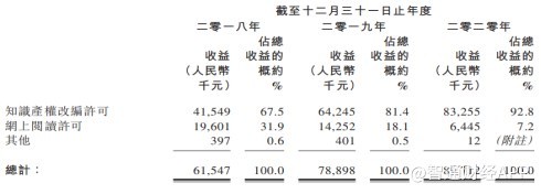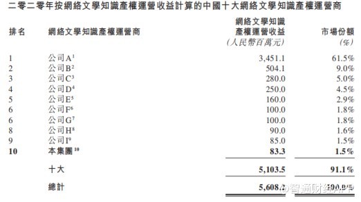 弗若斯特沙利文報告顯示,以 2020 年網絡文學知識產權運營產生的收益計算,中國的網絡文學知識產權運營市場由最大行業參與者以 61.5% 的市場份額為主導,而五大行業參與者的市場份額為 82.9%。